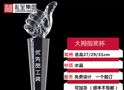 大拇指水晶定制高檔獎杯適用于公司年會及員工獎勵.可上色也可選擇照片彩印.大拇指水晶定制高檔獎杯年會禮品可免費設(shè)計,一個獎杯配送一個包裝盒.